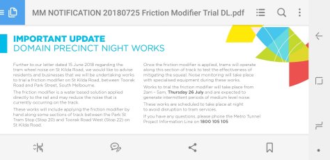 Metro Tunnel Friction modifier work tonight July 25, 2018 Gary Buck Leave a comment See attached Share this: Click to share on X (Opens in new window) X Click to share on Facebook (Opens in new window) Facebook Like Loading...