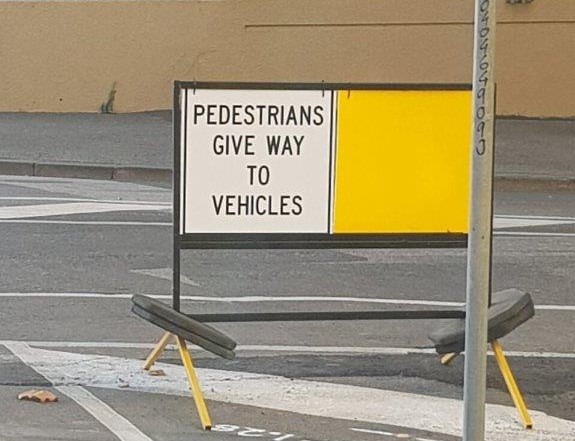 Now strictly speaking the signs are right. Peds heading south should give way to cars on their right because those cars are not turning and the cars coming towards them are turning so they have to give way.