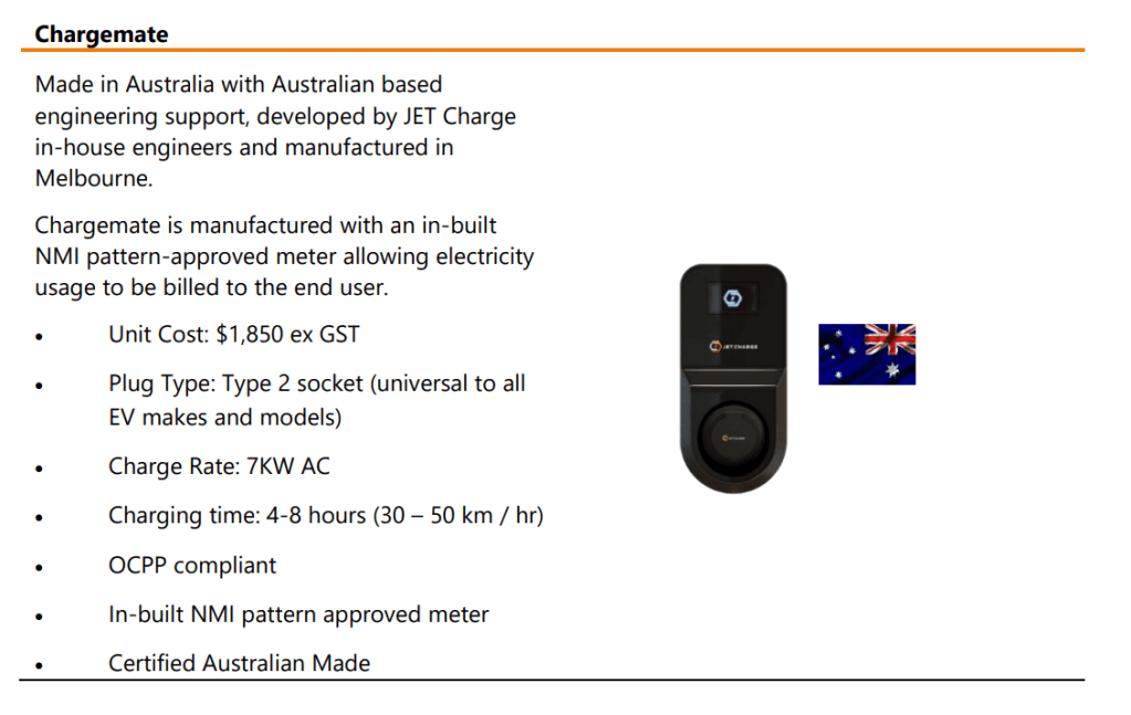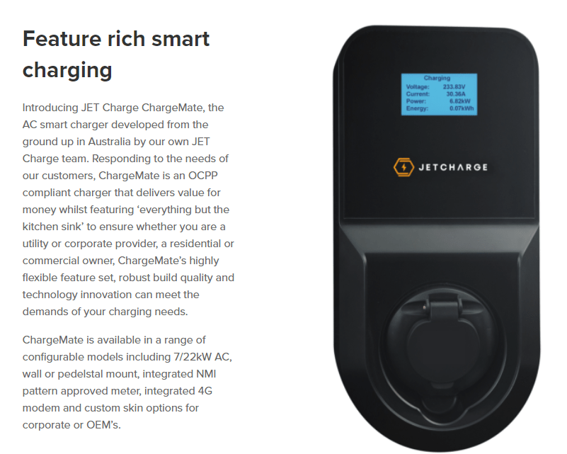 The chargers we are recommending today are JetCharge Chargemates. They work with all EVs sold in Australia. The chargers that can be installed at any time must be compliant with our system.