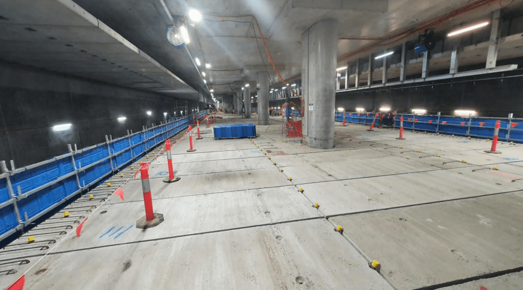 If you walked down to the platform level you can now stand on the future train platform, as the pre-cast sections of concrete continue to be installed from south to north. We’ve included a photo this week standing on top of the platform. A few things to note in the picture – If you look at the nearest pillar, you can see a groove at the bottom – this is final level that the topping slab of concrete and tiling for the finished station platform will come up to. Also in the top right of the photo you can see some steel structures hanging from the ceiling, these are the structures that will support the future platform screen doors.