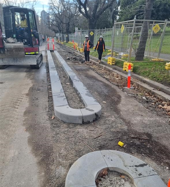 From the northern end of site, preparations are underway for the next stage to realign the southbound lane on St Kilda Road. Road works and kerbing of the Copenhagen style bike lanes will continue here next week, framing the future southbound lane in its legacy position. As these works move further south towards the pedestrian crossing, you may see some minor shifts of site fencing at our site gate entrance which will ensure the continuity of the kerbing and asphalting over the coming weeks.