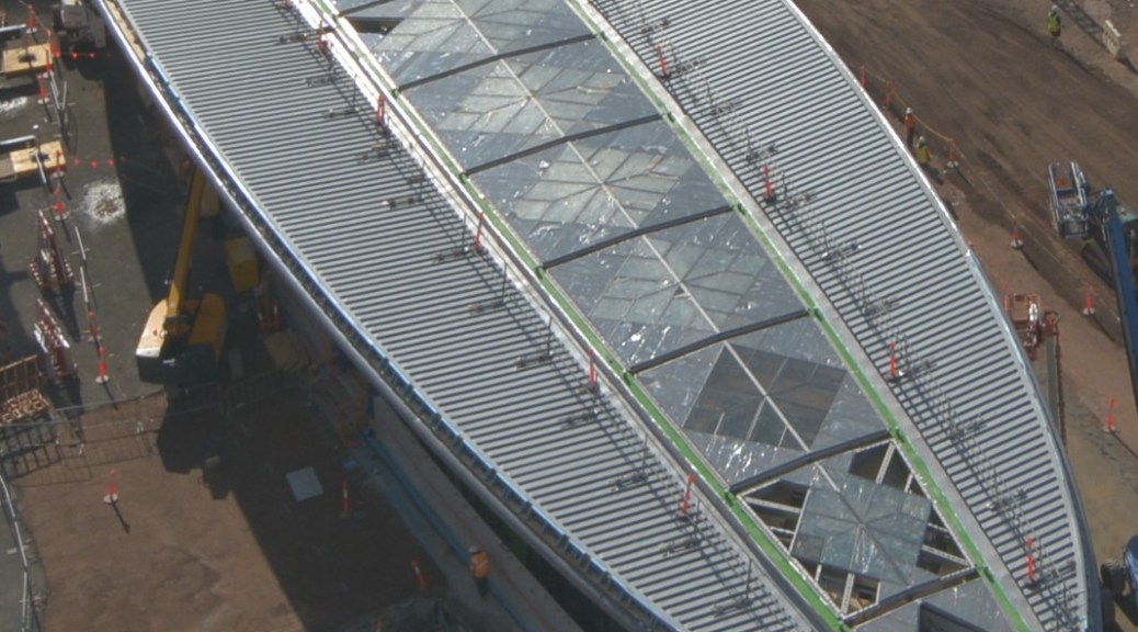 You will notice that almost all of the skylights have now been installed onto the internal diamonds of the canopy, with the final architectural details of the colour back glass soon to be added.