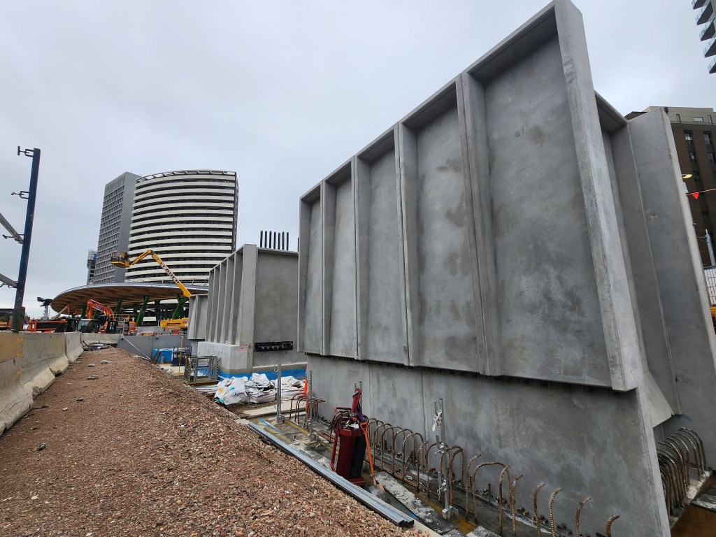 On top of the southern station box, backfilling will recommence once craning of the ventilation precast panels and waterproofing is complete.