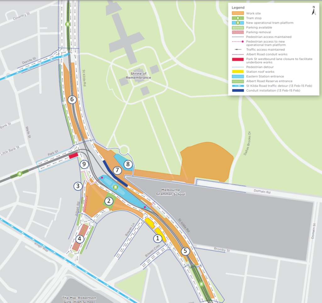 The under bore works to complete the high voltage conduit connection under St Kilda Road are now complete and awaiting CitiPower to make the final tie in. This will require some additional excavation works at the corner of Park Street and St Kilda Road and we understand that CitiPower are looking at commencing these works in mid-March. The much awaited reopening of the left turn from St Kilda Road into Park Street is expected at the end of March.