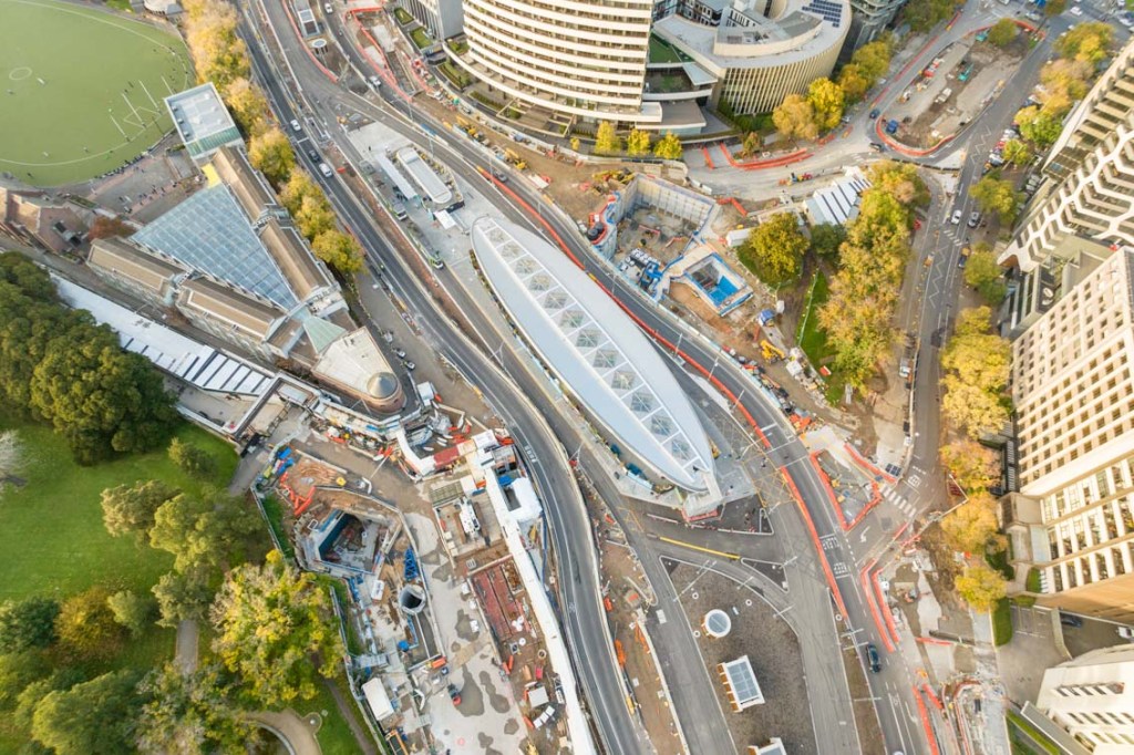 One section that will see a great deal of change over the coming weeks is Albert Road. The Albert Road configuration is slowly but surely transitioning to its future alignment, which will see the westbound lane pushed further to the north to make room for the future parkland between the station entrance and Kings Way. In the June monthly construction update, you’ll see that Albert Road will essentially shift into a one-way arrangement between Kings Way and St Kilda Road. The closure of the last remaining section of the westbound lane of Albert Road will enable the team to complete the final kerbing at the intersection of Kings Way and Albert Road – and start the works on the actual parkland itself. We’re expecting that these works will take just over a month to complete.