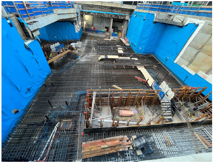 Precast elements continue to be installed in the shrine entrance. Works continue on the raft slab which will support the future stairs and escalators into the station entrance, as well as the canopy.