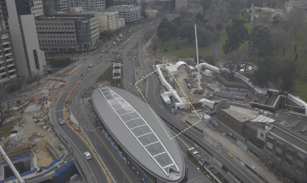 As we’ve mentioned in previous updates, we are about to close our two remaining logistics voids in the station roof. Those with a view over the station would see that this has been used to lower materials into the station, as well as run our site elevator that has allowed material to be transferred down to the concourse level. Once we’ve closed these voids, we’ll be able to start work behind the barriers on installing services and constructing the kerb for the second lane of traffic through this section of St Kilda Road (this is the continuation of the traffic lane we referenced in the section above)