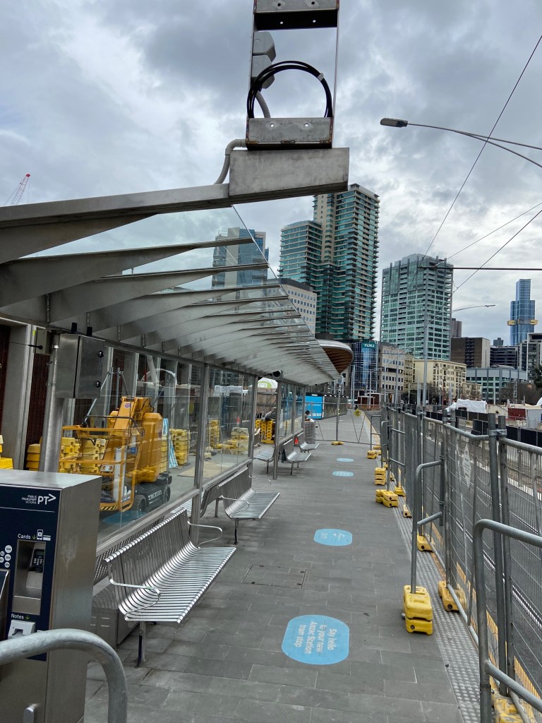 The glass on the tram shelter has been installed. Over the next few months you will start to see the hoarding on the tram platform start to be scaled back.