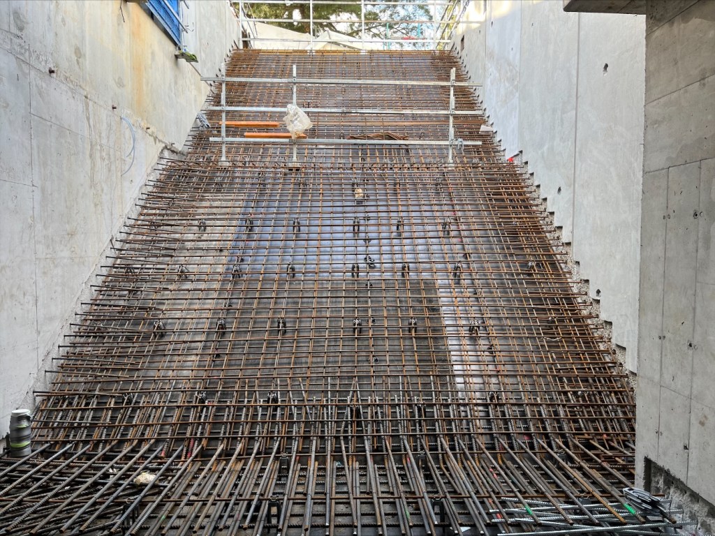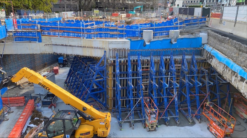 Nothing new to report in the station entrance, it’s more of the same as the team continue the steel fixing and concrete pours for the station walls. We have poured seven of the walls so far, we’ve included a picture of the formwork below.