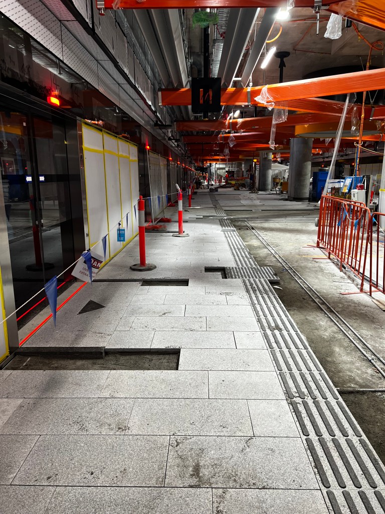 The station works remain fairly consistent, with granite paving going down on the train platform and the fitout works for individual rooms continuing on the concourse level. A picture of the paving is below.