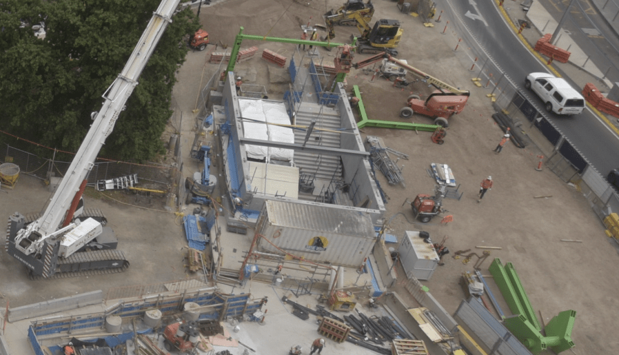 You may have noticed today that the green steel has arrived for the station canopy and installation has commenced. Just as with the Shrine, once all the pieces are in place scaffolding and roofing will follow.