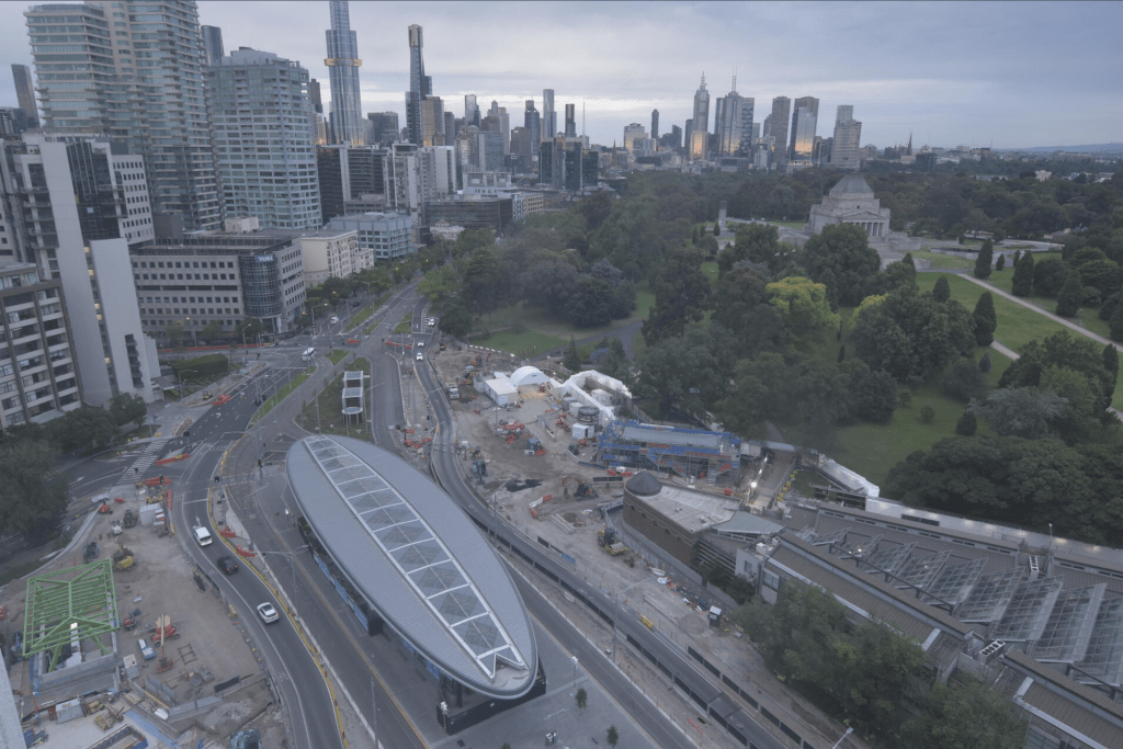 As we mentioned last week – the view of the new station entry canopy at Albert Road Reserve will be short-lived, as we surround it in scaffolding to allow the installation of the roof and services on the canopy. I’ve included a quick photo of the site today, you can see the scaffolding surrounding the Shrine entrance canopy on the right of the shot, with a similar structure to follow for the Albert Road entrance.