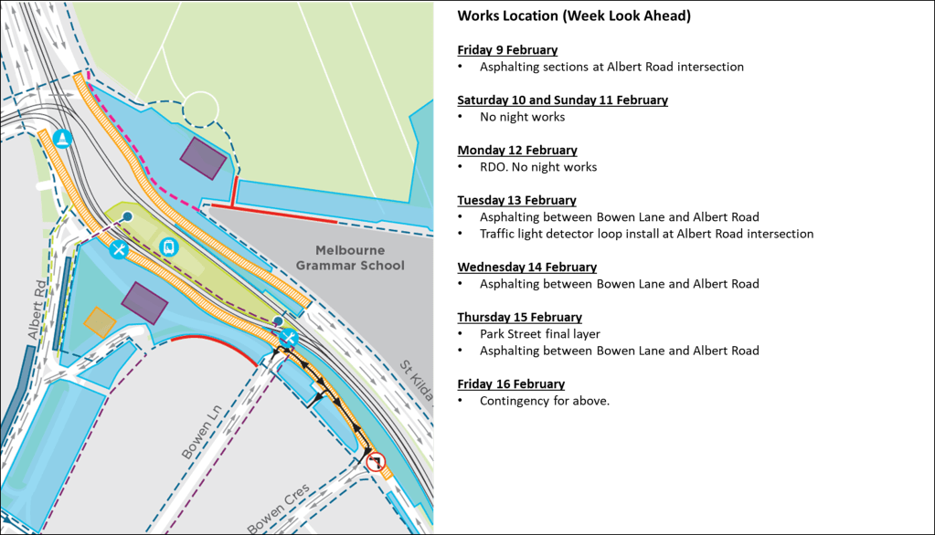 As mentioned in the February construction notification, next week we’ll close the left turn from St Kilda Road into Bowen Crescent. This is to enable the works to resurface the footpath on the southern side of the road, and prepare a tree plot in this area. A pedestrian detour via the separated bike lane will be in place during the works, access to local businesses will be retained during the works.