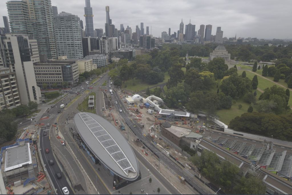 With the pedestrian crossing point towards Melbourne Grammar now closed, works have begun on the forecourt of the station entrance, this area will sit alongside the reinstated Domain Road, which will also begin its rebuild very soon.