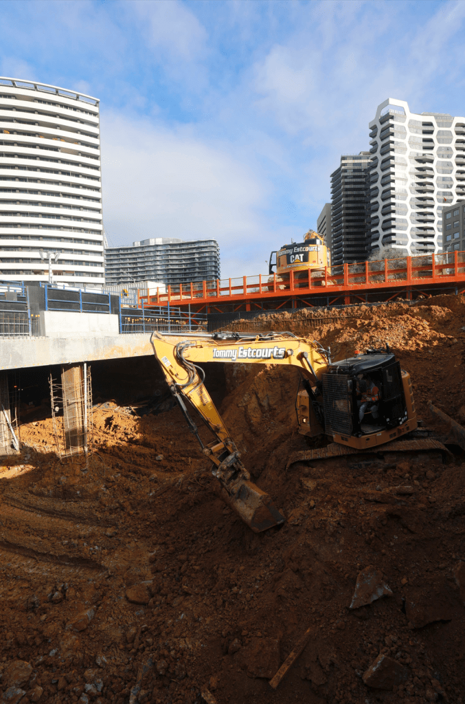 Works are starting on the future bus stop in front of the entrance, while elsewhere we are busy getting stuff in the ground, whether it be footings for light poles, or cables to service the station. The aim is to keep our pavers rolling continuously from north to south. We’ve poured a fresh section of concrete where they’ll lay fresh bluestone pavers. Perhaps not this week, but more likely next week, we’ll start the formwork for the wide set of stairs that lead from the concourse down towards SASM.