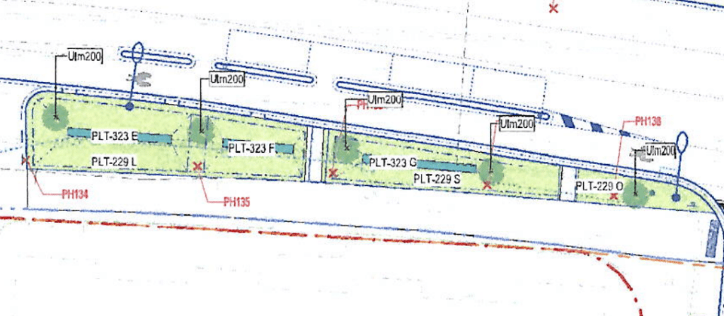 This is still the plan for trees – five in front of us (I think they are waiting for the garden to become established before digging it up), two in front of 390 SKR and 10-11 in the middle near the chillers.