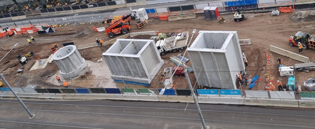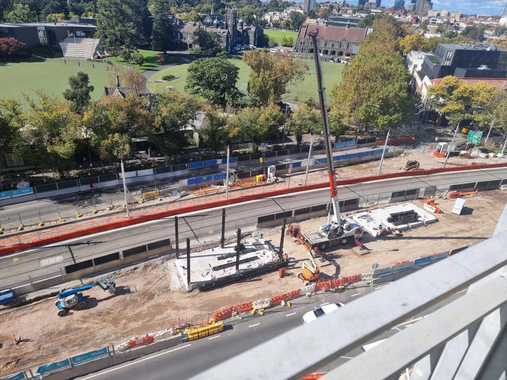 There has been a lot of change out on site recently with the site now divided by the new section of southbound lane of St Kilda Road. This has allowed the us to shift our barriers onto what was the previous southbound lane and begin to breakout the old traffic lane to lay new tram tracks and lay the new road alignment adjacent to these tracks. Thankyou to everyone for you patience as we tied in the new section of the road, the significant amount of rain did not help matters, but the new lane is now open and we’re pushing ahead.