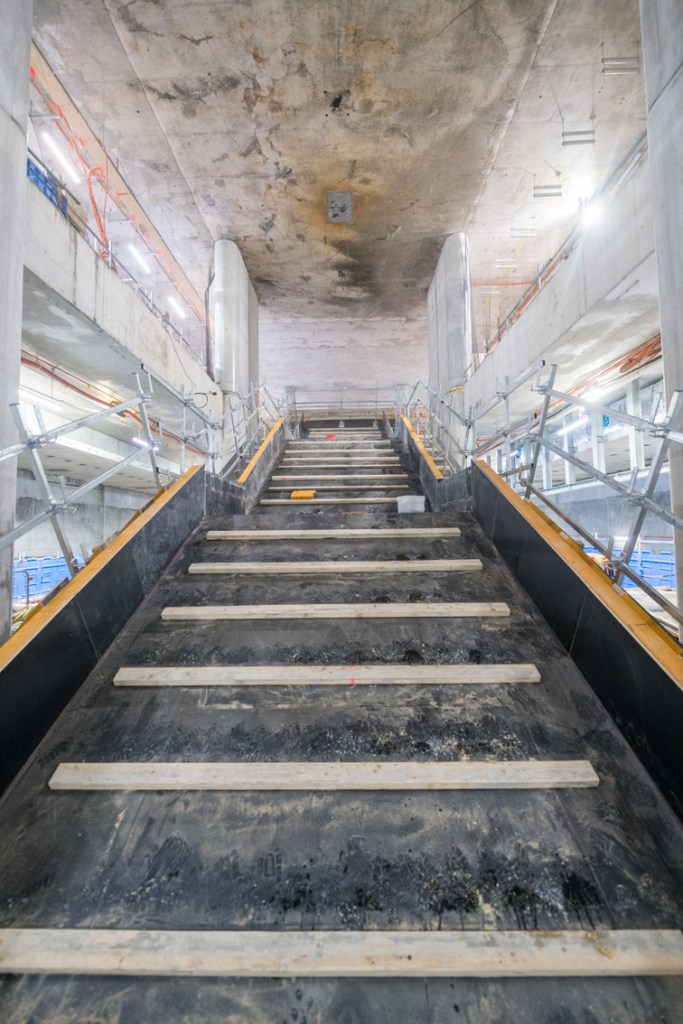 The big development inside the station box is the start of the construction of the stairs from concourse level down to platform level. The frame for the future pedestrian elevator has also been installed. We’ve included a photo this week on the first section of the formwork for the new stairs.
