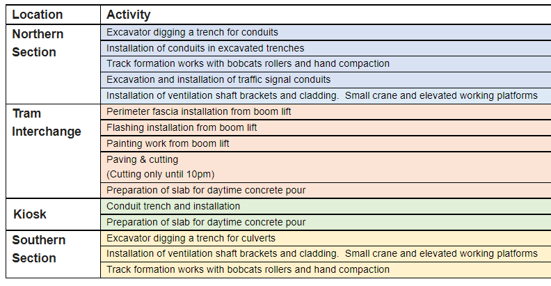 The works listed below are those that will extend overnight next week. At this stage of the program, all these works are likely to extend for the duration of the week.